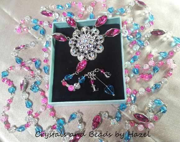 materials: crystals, crackled beads, spacers, crystal brooch (centerpiece)